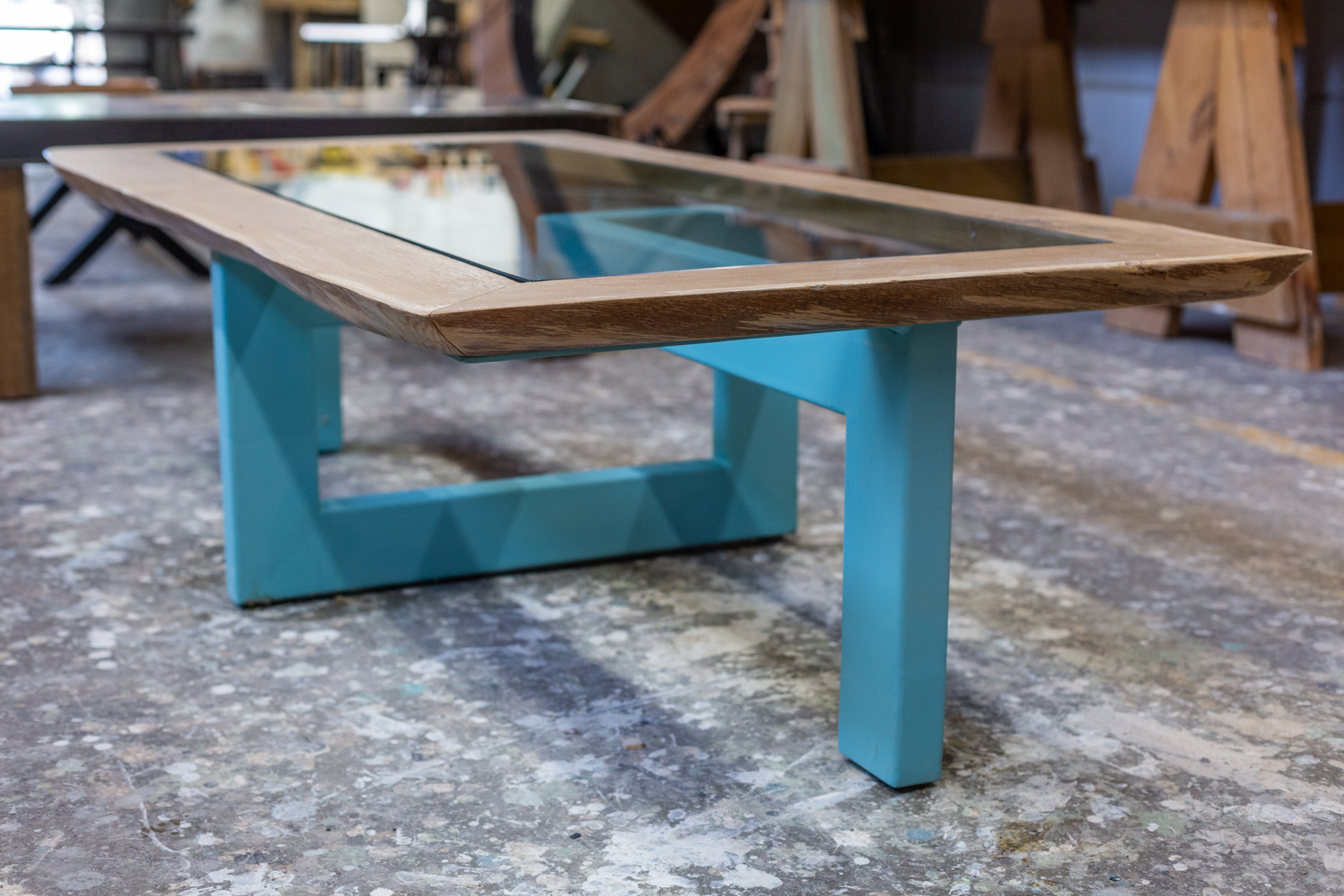 שולחן סלון ייחודי מעוצב, מסגרת מעץ אלון בשילוב של זכוכית ורגליים מברזל בעיצוב לא סטנדרטי מידות 172X85 גובה 46